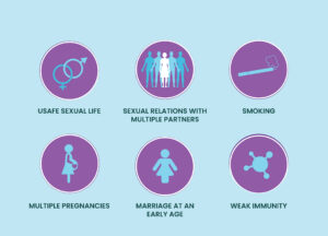 - Human Papillomavirus (HPV) infection is the most important risk factor. It has more than 150 variants. Some may cause only warts on the skin, genitals, throat, mouth. These are called low-risk types of variants some cause cervical or vaginal or vulval or penile cancer, these are known as high-risk type HPV. HPV types 16, 18, 31 33 are high-risk type of HPV variants. Out of all 16,18 causes 70% of cancer worldwide. And females who become sexually active at young age(<18) or having multiple sexual partners are likely to infect with HPV. In 1996 World health Organization (WHO) declared HPV as the major cause of cervix cancer.