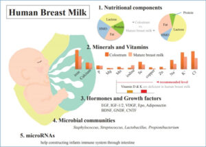 It is the irreplaceable source of nutrition in the early days of life. It contains 87-88% water, 124 g/L macronutrients, which include 7% (60-70 g/L) carbohydrates, 1% (8-10 g/L) protein, and 3.8% (35-40 g/L) fat. Colostrum is low in fat but high in protein, especially whey and casein. It is rich in immunoprotective components like IgA, lactoferrin. Human breast milk is rich in growth factors, microbes, and microRNAs, which are essential for to development of the newborns. Lactose is the major carbohydrate constituent of the breastmilk. Fat is the second-largest component of human milk. It contains 2 essential fatty acids, i.e., linoleic acid and alpha-linolenic acid, which further break down and form docosahexaenoic acid(DHA). DHA is important in the development of the central nervous system and